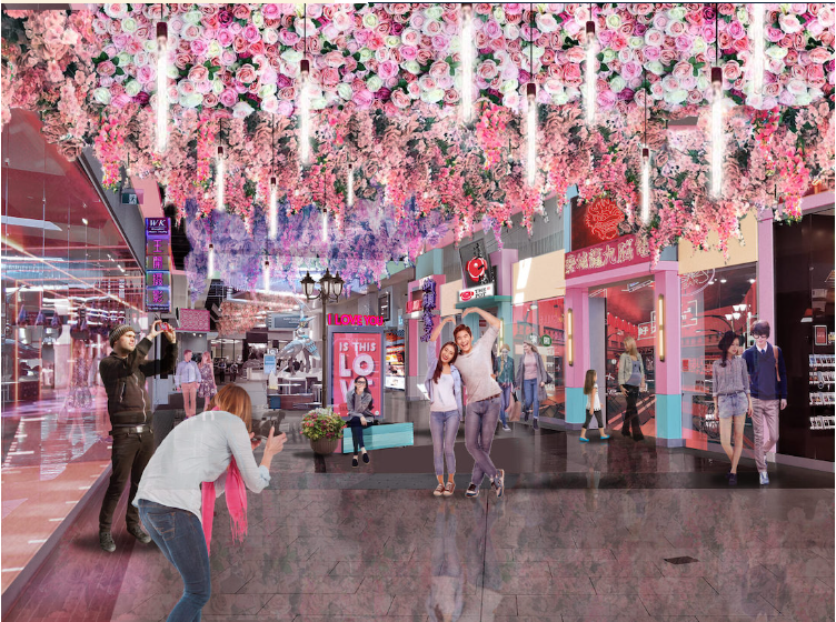 一个长达180英尺、浪漫主题的“恋人长廊”,头顶布满仿真花海与LED灯效;