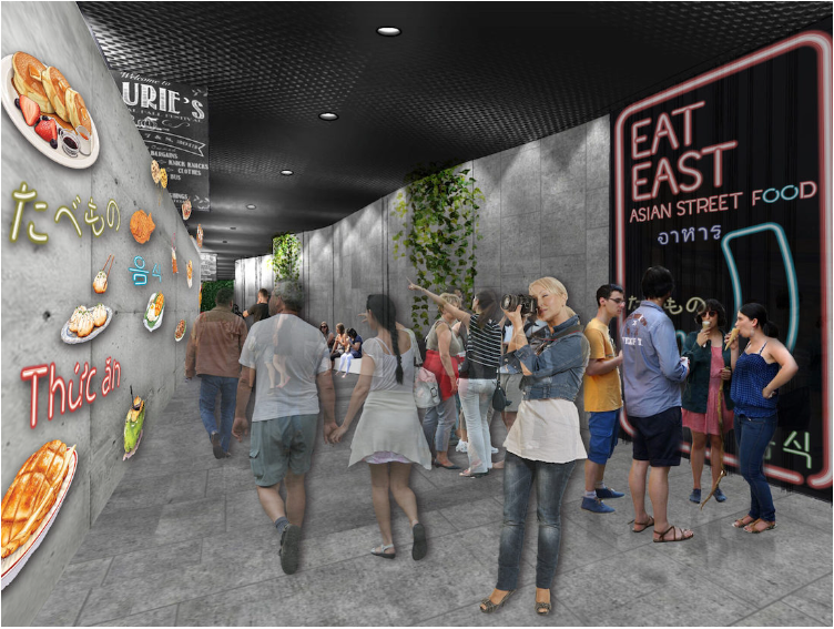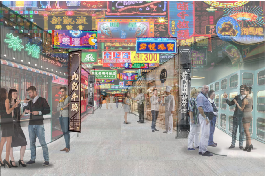 而最吸引华人眼球的,无疑是中华风十足的美食街规划。从曝光的初步概念图来看,整条街区设计灵感明显来自上海、香港、广州等地的城市夜景,悬挂的中国灯笼、霓虹标牌与街头艺术涂鸦交相辉映,搭配街头摊档、开放式厨房和公共餐桌,营造出极具烟火气的“回国感”。
