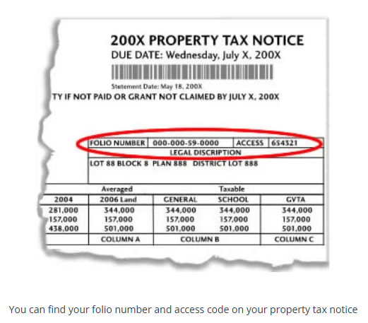 3. 输入您的物业编码 (Folio number) 和密码(Access code)。您可在税务通知单的正面找到这些信息。