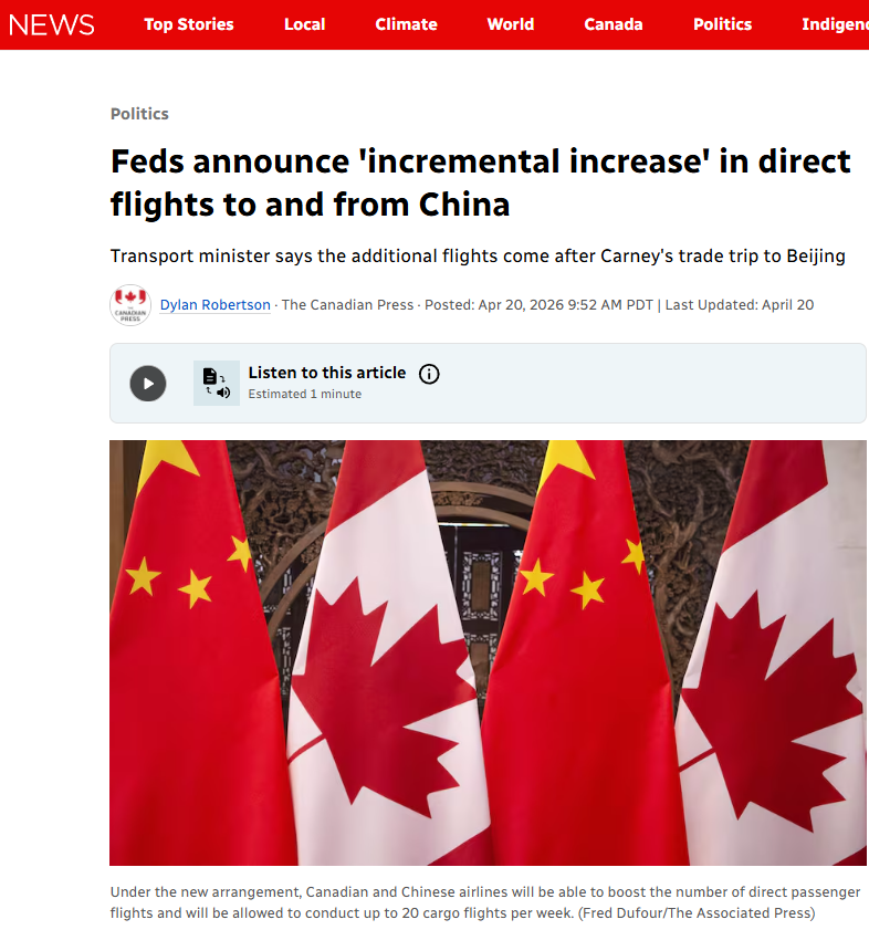 就在本周一(4月20日),加拿大联邦政府宣布,将扩大加拿大与中国之间的直飞航班数量,并进一步开放航空运输权限。这一政策不仅关系到华人群体最关心的“回国机票”,也被视为加中经贸关系和航空市场的重要信号。