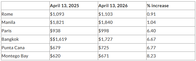 根据4月13日当周的数据,Kayak统计了从加拿大出发的经济舱往返机票平均价格,并与去年同期进行比较。令人惊讶的是,国际航班平均票价仅上涨了1.20%——从2025年4月13日的平均1,165加元,上升到2026年4月13日的1,179加元。